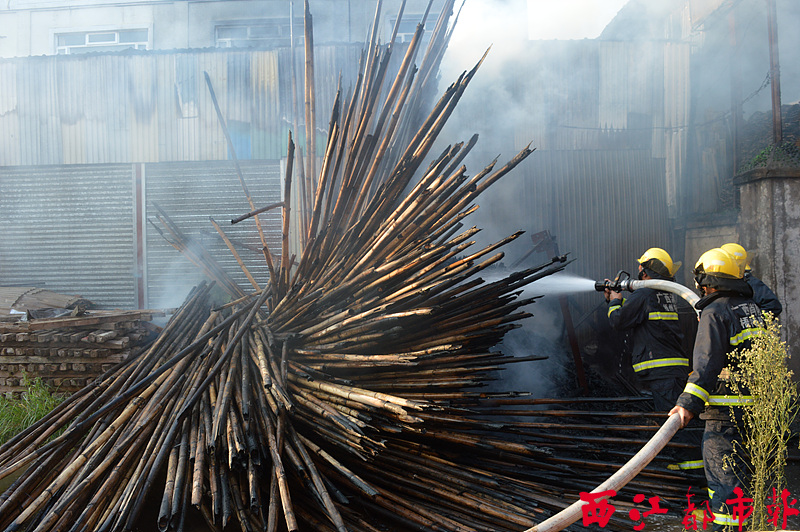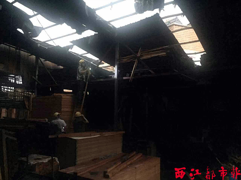 ????當(dāng)天19時(shí)30分左右,記者接報(bào)趕到火災(zāi)現(xiàn)場(chǎng)時(shí),起火的木材加工廠已經(jīng)沒(méi)有明顯火苗,消防官兵也已撤離。在木材廠外的一堆竹子被大火燒壞散落四處,民房對(duì)出搭建的棚子頂部已被燒毀,堆在棚里的一些木材也有被燒過(guò)的痕跡,而民房的墻壁也被熏黑,窗戶被燒毀。木材廠內(nèi)有一名工作人員正戴著頭盔用梯子爬上棚頂,檢查是否還存在陰燃余火,一旦發(fā)現(xiàn)存在冒煙的地方,便立即用水澆滅。