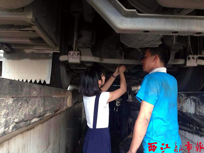 西江都市報記者在機(jī)修師傅的指導(dǎo)下給車輛上底盤螺絲。葉穎/攝