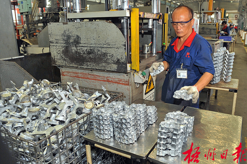 ????7月26日,在梧州市鴻圖精密壓鑄件有限公司車間,工人正生產(chǎn)鋁合金配套壓鑄件。