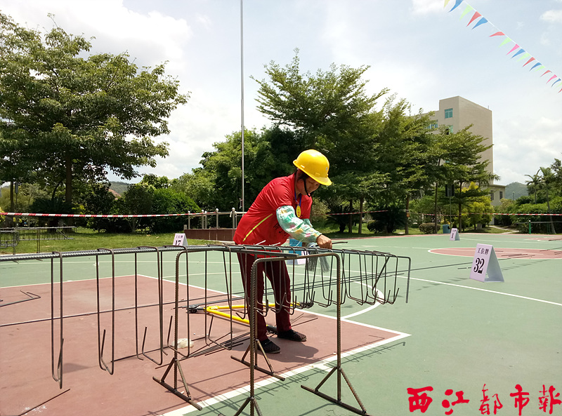 比賽現場,參加鋼筋工項目比賽的一名女農民工正在利用鐵絲固定鋼筋。(西江都市報記者 蒙敏瑩/攝)