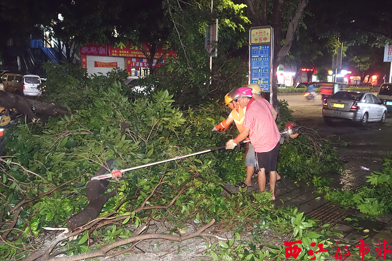 7月31日21時(shí),梧州市園林綠化工程處的工人在清理新興二路一帶傾倒的路樹(shù)。記者 龍?zhí)靷?攝