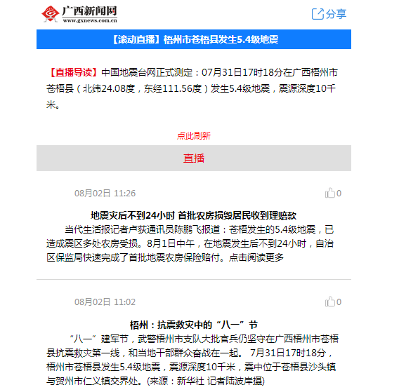 廣西新聞網(wǎng)對(duì)我市蒼梧縣地震進(jìn)行后續(xù)滾動(dòng)直播報(bào)道