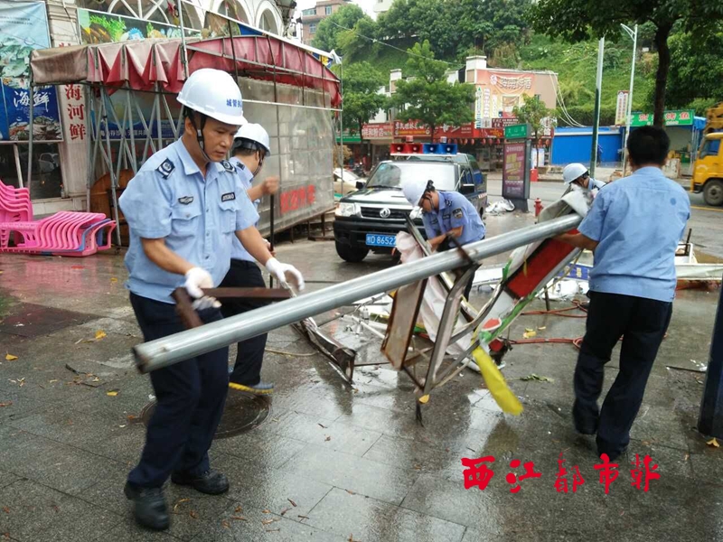 ??? 西江都市報訊(記者 謝韻 通訊員 高遠 何岸)受臺風“妮妲”的影響,梧州市昨日降雨持續,為防范降雨天氣帶來的不利影響,梧州市市政和園林部門積極應對,各城區城監大隊加強街道巡查,并通知業主及時處理存在安全隱患的廣告牌。