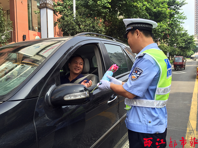 8月9日七夕節,民警為主動禮讓行人的司機送上玫瑰花和礦泉水。 楊珊/攝
