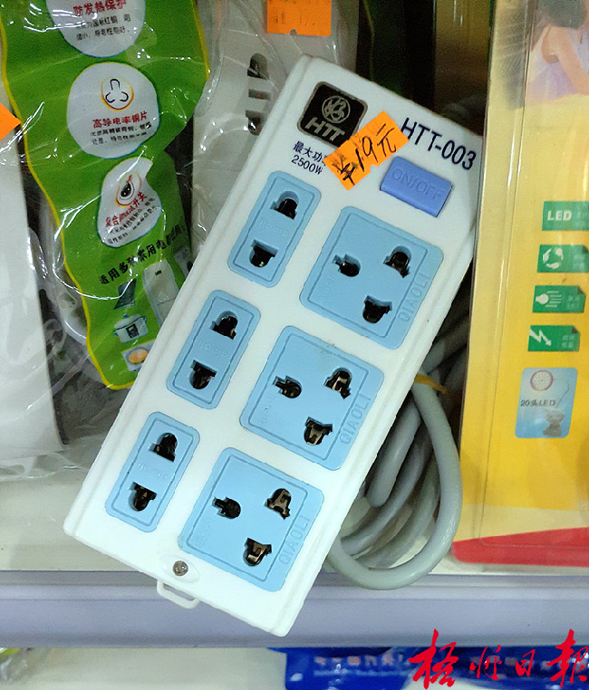????8月9日,記者在大東路一雜貨店看到仍有“萬能插座”銷售,“萬能插座”屬于淘汰產(chǎn)品,國家已明令禁止銷售。 曾韻 攝