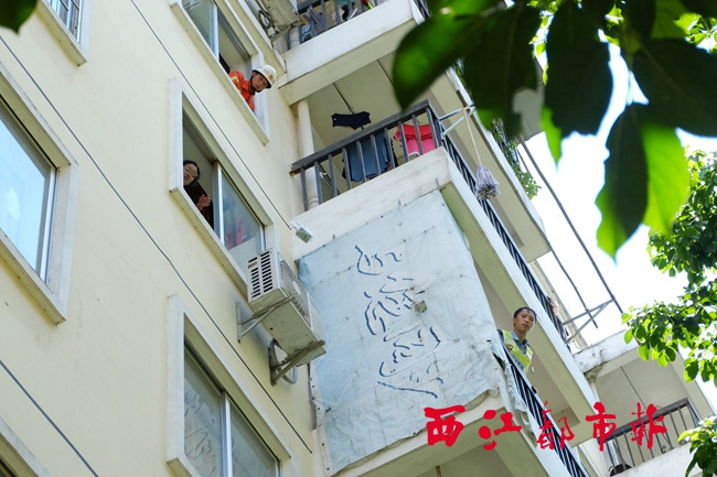 ?一在公安干警的勸說下,將自己反鎖在房間內的女事主,終于主動將鑰匙放進一個罐頭內扔下樓,讓營救人員開門。 西江都市報記者 何鎏/攝