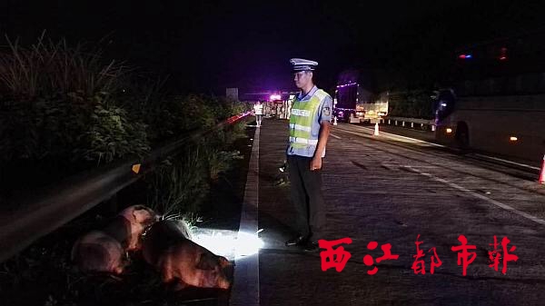 ??? 西江都市報訊(記者 楊珊 通訊員 陳志遠)8月15日晚,一輛滿載生豬的貨車在廣昆高速梧州段突然爆胎側翻,車上運載的部分生豬隨之被顛出車外,四處亂竄。無奈之下,高速交警和路政人員只能臨時當一回“趕豬人”,奮戰四小時,才終于將出逃的“二師兄”轉運完畢。