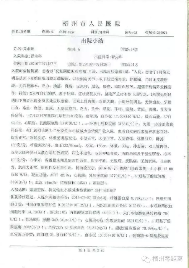 ????7月24日,小琳來到了梧州市人民醫(yī)院就診,驗血后發(fā)現(xiàn)血小板數(shù)值為17(*10?/l),遠低于正常值125-300(*10?/l),在留院觀察期間血小板數(shù)值仍在不斷下降,相當危急。黃智說,7月27日下午小琳進行骨髓穿刺檢查,判斷結果顯示為急性淋巴型白血病。為了早日得到更好的治療,小琳的父母第二天就將她送往廣西醫(yī)科大學第一附屬醫(yī)院治療,到了8月4日得到最終確診結果為急性淋巴細胞白血病L2型。