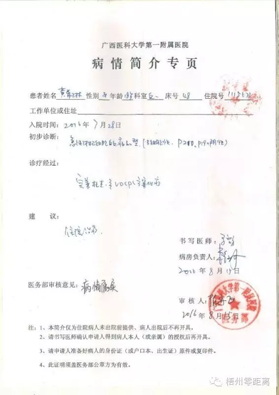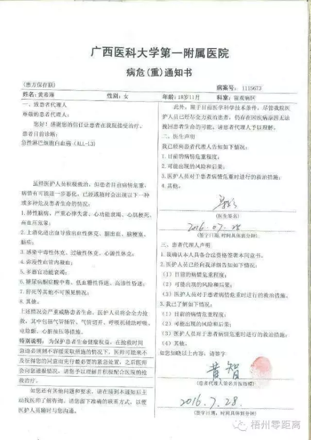 ????廣西醫(yī)科大學第一附屬醫(yī)院7月28日下發(fā)的病危(重)通知書