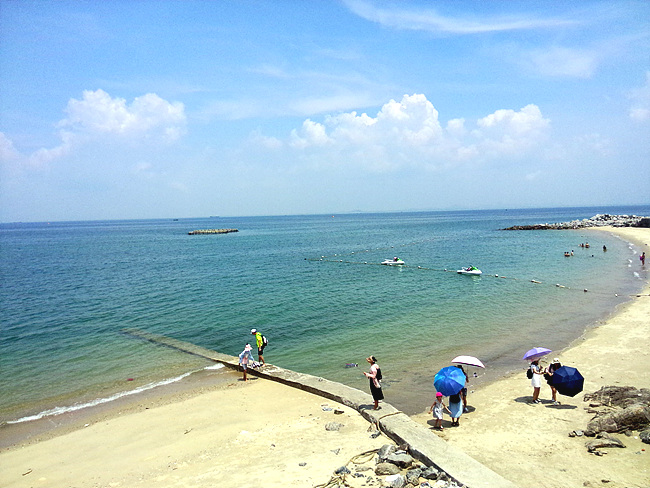 ????放雞島周圍的自然景觀是美麗迷人的,到大海游泳博浪擊水又將會有另一番別樣的情調。海水非常清澈,一眼就能看見腳下的貝殼。站在海岸線上,也可以看見幾米深的魚兒在水下嬉戲游玩,尤其是黃金海灘坡度徐緩、海浪柔和,是難得的天然浴場。我脫了鞋子,赤足跑到水里去。一群群五顏六色的小魚兒立刻圍攏過來,在腳邊盡情暢游,我欲放手撈魚,滑溜溜的,哪里這么容易捉得到。孩子們已經一屁股坐到水里去了,分不清是人在誘惑著魚,還是魚在誘惑著人?