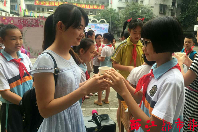 今日是我國第32個教師節(jié)。昨日,梧州市萬秀區(qū)工廠路小學(xué)的同學(xué)們,在校內(nèi)開展了“向老師敬一杯茶”的活動,用一杯清茶來表達(dá)濃濃而純潔的師生情,同時為老師送上節(jié)日的祝福。 (柯萬杰 李滿枝)