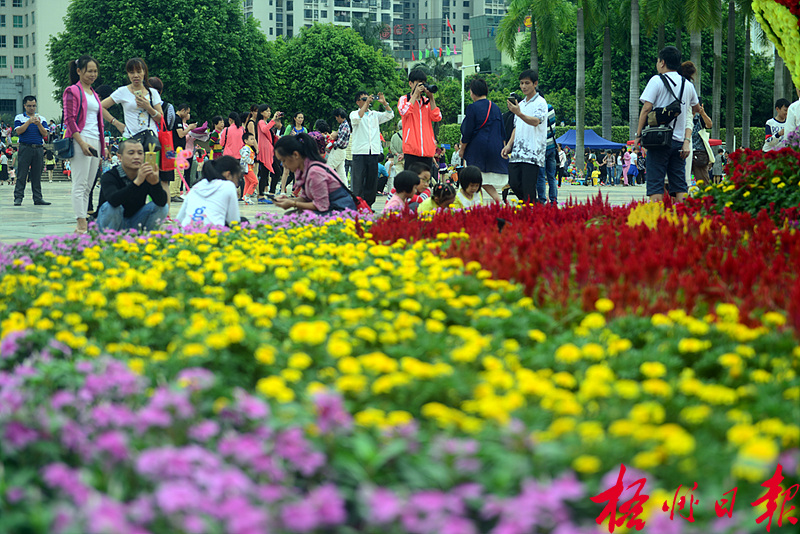 10月1日,在市政廣場,市民在國慶主題花壇前拍照留念。李煜榮 攝