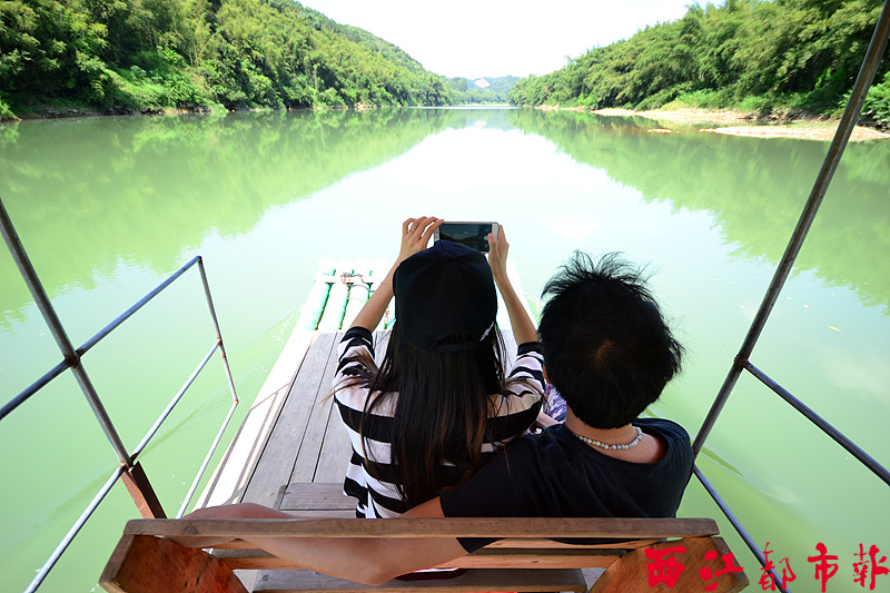 兩名游客乘坐竹排欣賞東安江景色。(圖片由游客提供)