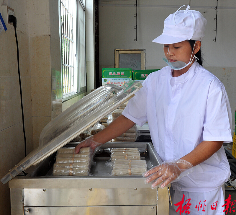 ????家庭作坊的姑娘正在用機器進行真空包裝三堡米粉。