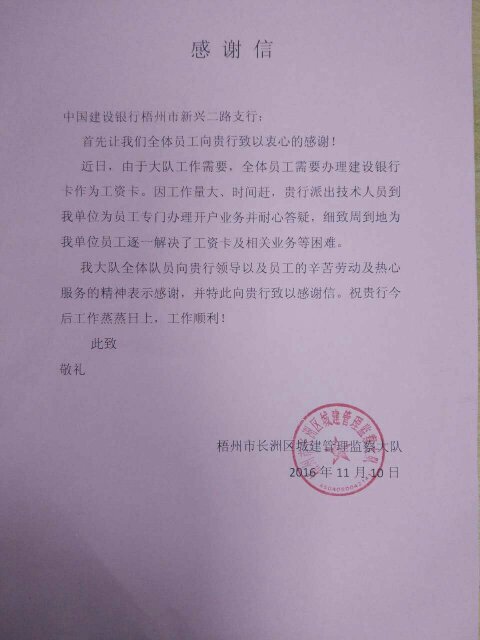 11月15日下午,建行梧州分行轄屬新興二路支行收到一封來自梧州市長洲區(qū)城建管理監(jiān)察大隊的熱情洋溢的感謝信,信中對新興二路支行員工在對其單位上門發(fā)卡過程中不辭辛勞,工作認真細致,服務(wù)專業(yè)的精神表示衷心的感謝和高度的贊賞!