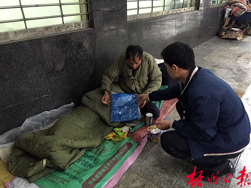 ????聽到聲音,另一名流浪男子從被子里探出頭來:“這里還有你們上次送來的棉被,我不冷,就是有點餓。”救助人員趕緊送去泡面、餅干和水,并勸說他到救助站。該男子說,他今年62歲,湖南人,十幾年來輾轉各地后到梧州流浪,靠拾荒度日。由于該男子不愿進站接受救助,救助人員擔心他受凍,給他留了棉衣,叮囑他要是想回家了就給救助站打電話,救助人員會為他購買返鄉的車票。