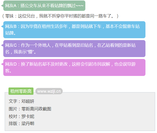 ????為此,零妹聯(lián)系梧州珍寶巴士有限公司反映情況。對于網(wǎng)友投訴的部分車站的路線導向圖仍使用舊站名一事,珍寶巴士公司一名范姓經(jīng)理表示,“由于更換各個車站的路線導向涉及多方面,且車站數(shù)量多,范圍大,全部更新需要不少時間,因此,未能及時做到全市所有車站的路線導向圖都更換為新站名,更改站名工作只能一步步展開。目前,各個車站路線導向圖正慢慢更改為新的站名?,F(xiàn)時有的路線導向圖暫時只能用貼紙貼上新站名頂替,日后,會重新更換整個站牌?!贝送猓督?jīng)理說,目前存在部分已覆蓋舊站名的貼紙被市民撕開的情況。而對于有部分公交車的報站系統(tǒng)沒有及時更新播報新站名的情況,范經(jīng)理說,一般公交車的報站系統(tǒng)是在公交車上路之前就錄制并安裝好的,要更換比較麻煩,需要重新制作音頻視頻,珍寶公司將會加快時間更換新的報站系統(tǒng),望市民能諒解。