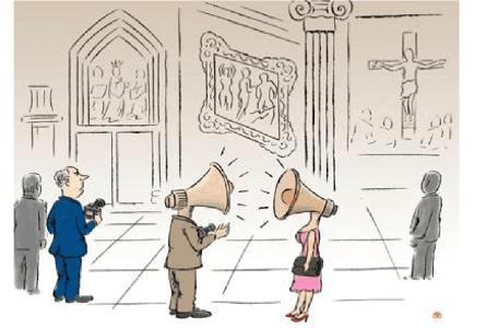 ????展覽館、博物館、圖書館都是講究環境安靜的場所,安靜的環境才能使參觀者靜下心來欣賞高雅藝術,感受藝術品帶來的藝術美感。因此,參觀者在館內盡量不要高談闊論,更不能大聲喧嘩。 |