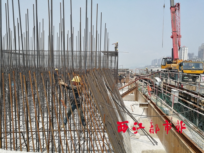 ????據西江四橋項目部技術主管譚晶介紹,水中12號和13號主墩承臺均已完工,混凝土也澆筑完成,接下來施工單位將進行墩身建設,6米高的墩身將分為三個階段進行施工。“在3月份時,西江水位突然上漲較快,差0.2米就淹到施工棧橋了,當時我們把機械和物料全部撤走了。目前,水面距離施工棧橋還有4米,所以我們加快進行水中兩個主墩的墩身建設。”譚晶說,“由于模板配置和人員有限,我們只能先完成13號主墩第一層墩身施工,再進行12號主墩的第一層墩身施工。”