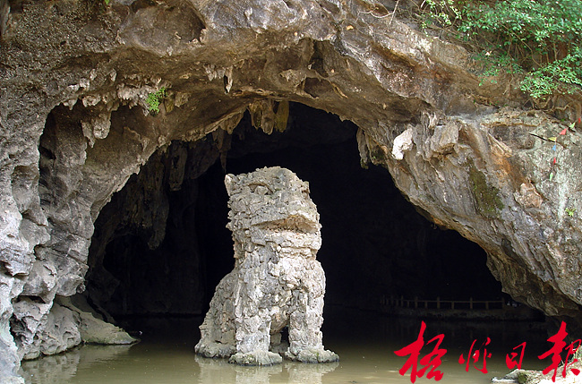 B/龍巖景色奇 走過千年古橋,下午,我們從新區的街道出發,僅用了10多分鐘就來到了龍巖通天洞風景區。 一座身著奇峰翠綠的石山,下面依偎著一個寬敞的巖洞,洞前一灣綠水,水中挺立著一頭威風凜凜的石獅子,恰似一個衛士,把守著這美麗的巖洞。 我們從洞口右側循小徑進入洞內,霎時涼風習習,整個人頓感涼爽舒心,將洞外帶進去的暑氣一掃而光。洞內有一處數十平方米的平地,十分利于游覽小憩。洞內鐘乳石懸掛,千姿百態,有的像人物,有的像動物,有的像翠竹。在洞內,能夠清晰地辨認鐘乳石景象,是因為在洞的頂部還有兩個洞口,像兩只天窗,光線絲絲縷縷地投射而入。傳說,洞里曾潛有兩條蛟龍,一次驚雷讓兩條龍破壁而飛,直通云霄,從而留下了兩個天窗,通天洞也由此得名。在朋友的指點下,我看到了廣西舊軍閥白崇禧的題刻:“破壁而飛”,遒勁有力,為書法家們所稱道。 一個普通的鄉鎮,竟然有著千年石拱橋、勝地通天洞,著實令人驚奇。難怪當代廣西詩人鐘家佐游龍巖洞時留詩贊曰:“久仰龍巖景色奇,登臨猶覺動云霓。山鄉亦有風雷壯,噴薄沖騰破壁時。”
