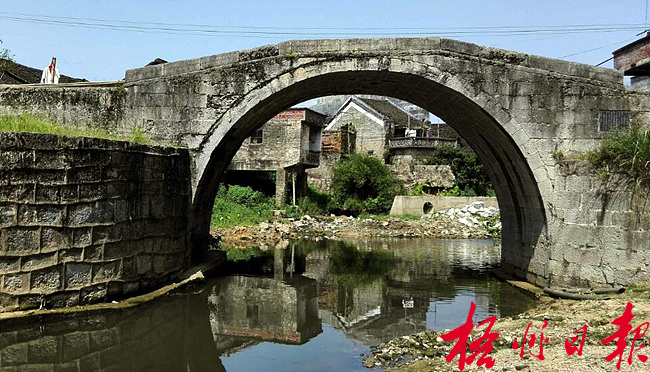 石橋鎮一角。 A/千年古橋今尚在 踏進石橋鎮,才知道她的古老與不凡。 經過改革開放后30多年的洗禮,鎮容已比過去擴大了幾倍,分為舊街與新區兩部分。我們首先參觀了古老的石拱橋。石拱橋坐落在新區與舊街的交接處,石拱橋橫跨小鎮南端的小河上,為單孔式,橋長30米,寬4米,橋孔跨度10.8米,拱頂距水面約7米,一律用人工鑿成的青石塊砌成。仔細辨看,可發現砌筑時不用灰漿,石磚銜接卻嚴密不露縫隙,線條整齊美觀大方,讓我們尤為感嘆當時工匠們的好手藝。 從這座橋走上去走下來,兩邊各是七級,橋真的不長,乍一看,橋并沒有什么特色,但是同行的朋友告訴我,石拱橋建成距今有千年!在朋友的引導下,我們走到橋墩的石刻前細瞧,上面果然刻著“建于宋時”的字樣。朋友特別強調,這里的“宋時”是指北宋哦,是我們這里當地一個文人考究過的呢。如是這樣,石拱橋已歷千年,我內心一陣驚嘆。