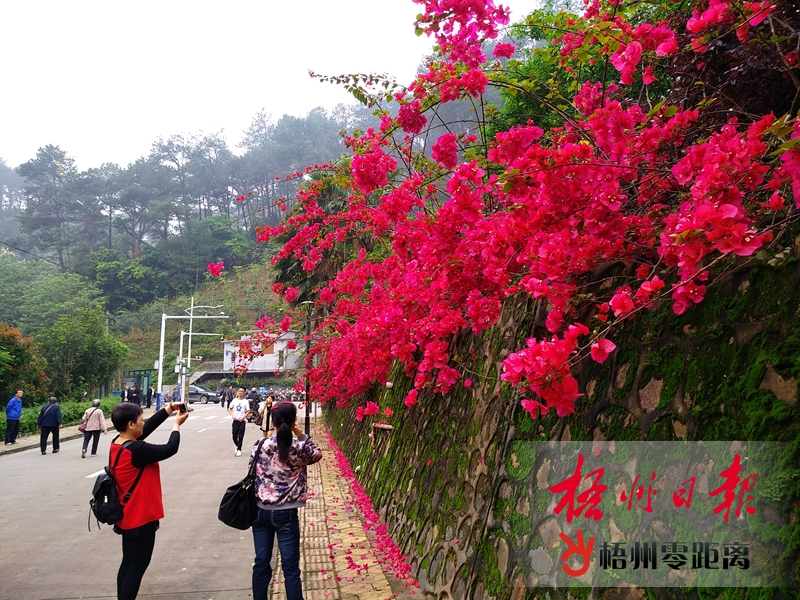 4月18日,在白云山山腳下,人們正在鮮艷的寶巾花下拍攝留念。時下我市雨水充沛、天氣暖和濕潤,市區內多處公園、廣場的寶巾花紛紛盛開,顏色鮮艷多彩,成為了一道亮麗的風景,吸引了市民游客駐足觀賞、拍照。