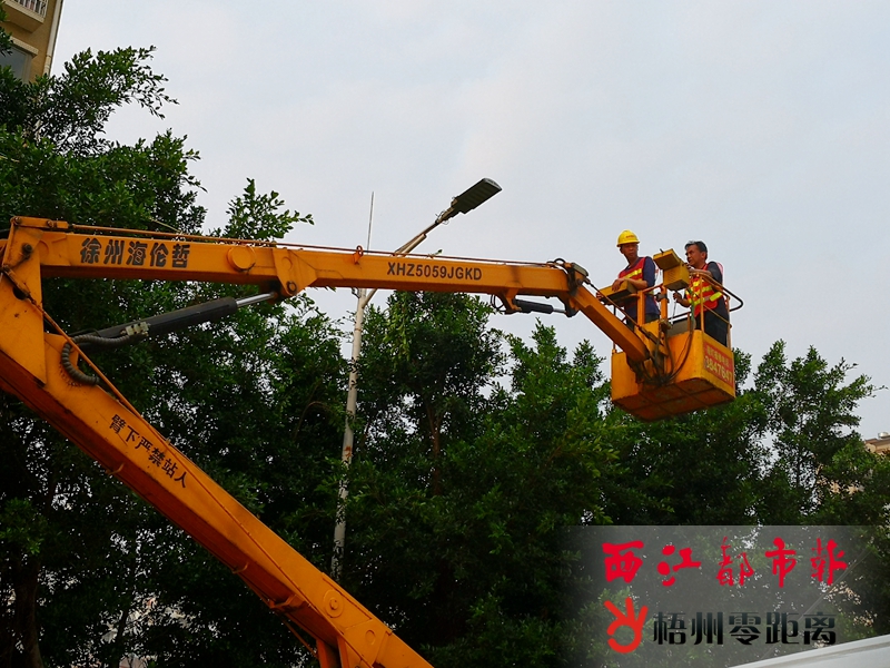 當天,梧州市路燈管理處組織20多名工作人員,在該處新裝9米高大功率LED路燈17盞,同時,對一批亮度不足的路燈更換大功率LED燈。工程計劃于當日晚上完成并正常亮燈,以解決該路段夜間光線不足的問題。