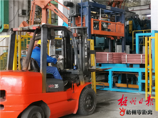 近日,在梧州循環經濟產業園區金升銅業公司車間,工人在打包陰極銅板,銷往廣東省。