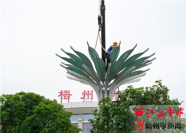 4月26日,施工人員在梧州南站站前廣場安裝茶樹造型的景觀燈。