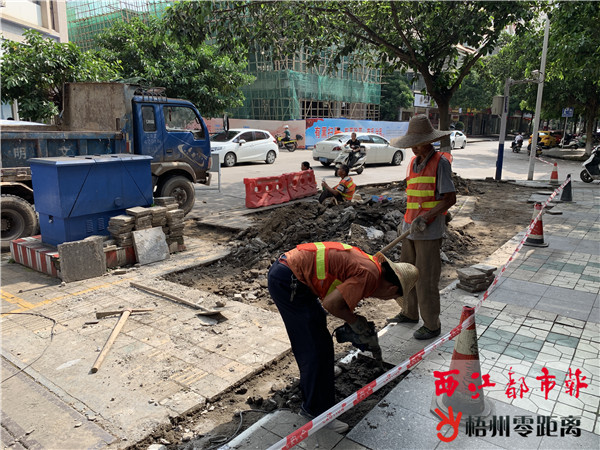 5月16日,施工人員在迎賓路破拆人行道破損的路面。