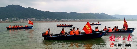 5月23日,在市防汛指揮調度中心大樓對出江面,參加集訓的民兵沖鋒舟操作手骨干開展編隊航行。 陳可夫 攝