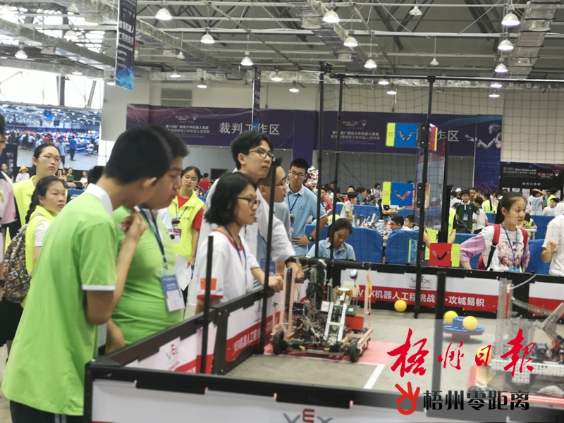 梧州日報記者 全淦枚 通訊員 梁勵 文/攝 5月23日至26日,由自治區科協、自治區教育廳、梧州市人民政府主辦的第18屆廣西青少年機器人競賽暨東盟國家青少年機器人邀請賽在梧州毅德國際博覽城舉行,來自廣西各市代表隊和東盟國家代表隊的參賽隊伍在梧州上演了精彩的智慧較量。 我市130名中小學生組隊參加了此次賽事。作為東道主,面對眾多的強勁對手,我市代表選手并沒有怯懦,而是充滿自信迎接挑戰,向對手以及廣大觀眾展現了梧州市在機器人教育方面的驕人成果。