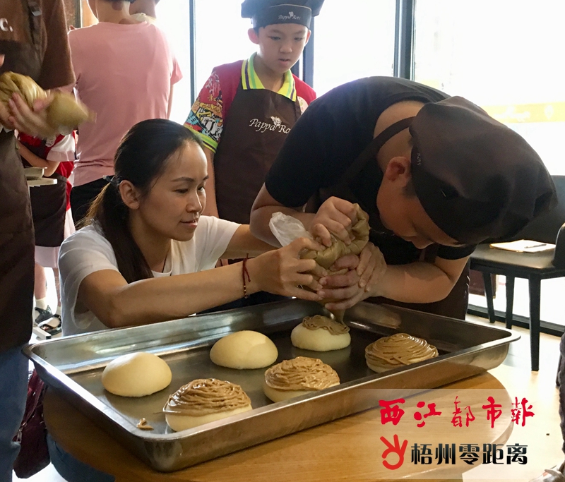 梧州零距離網-西江都市報訊 “爸爸,你看我學會制作咖啡了。”“媽媽,你喜歡什么形狀的咖啡拉花?”“爸爸你來幫幫我,面包醬料怎么擠才能均勻?”……6月1日,“六一”兒童節到來之際,梧州日報社小記者研學團的20組家庭來到“帕帕羅蒂”烘焙咖啡店,學習面包和咖啡的制作,共度歡樂的親子時光。