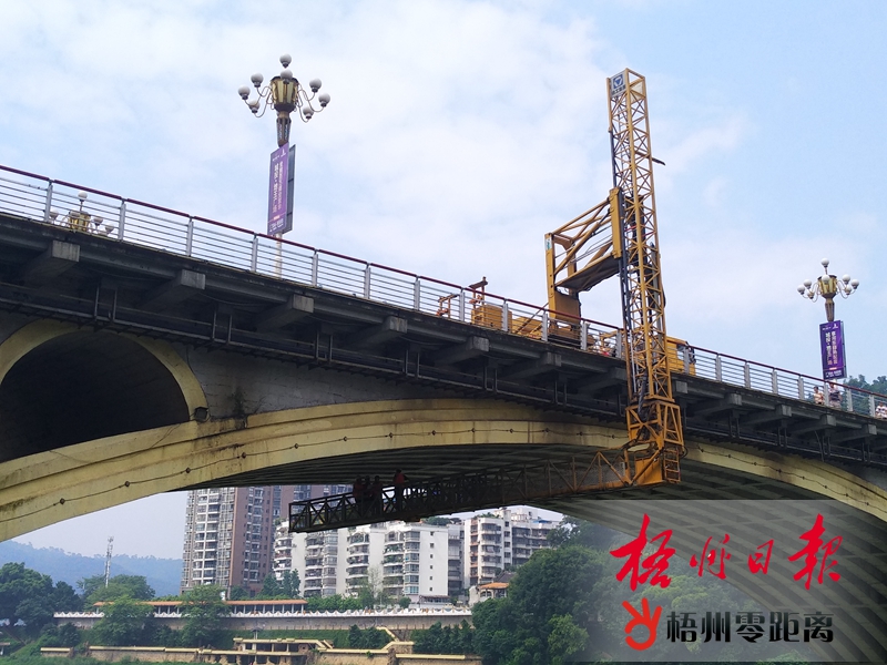 6月4日,工作人員正在對桂江一橋的橋拱進行檢測。