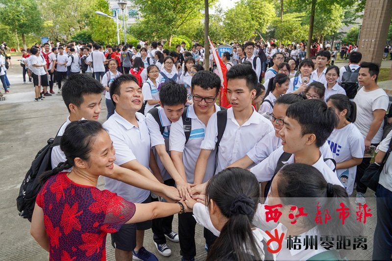 6月7日,在梧州高中考點(diǎn),老師和考生一起握手,為考生加油打氣。記者 陳凡 攝