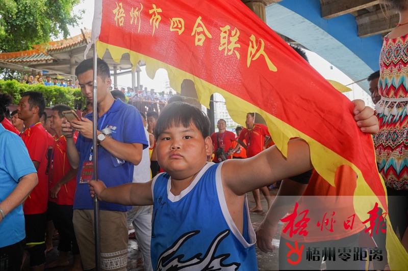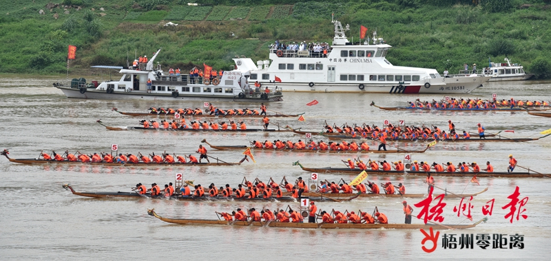 “砰”!上午11時(shí),隨著發(fā)令槍響,13支龍舟如離弦之箭,在河面上劈波斬浪、疾速前行?!?、2、1、2……”隊(duì)員們奮力揮動著船槳,他們個(gè)個(gè)精神飽滿、意氣風(fēng)發(fā),響亮的口號喊起來,水花四濺、鼓聲陣陣。所有隊(duì)員朝著同一個(gè)目標(biāo)前進(jìn),只為勇奪冠軍。 水上龍舟競渡百舸爭流,青壯男子奮力劃槳;群眾沿河而站,為龍舟大賽吶喊助威。激情四射的龍舟競渡讓在場市民熱情高漲,直呼“過癮”。今年65歲的劉女士拉上鄰居,特意從泗洲村趕到防洪堤觀看,“我起了個(gè)早,找了個(gè)好位置,近距離地觀看比賽。”劉女士激動地說,現(xiàn)場比賽很震撼,明年比賽還要繼續(xù)來看。 激烈的賽事也吸引眾多攝影愛好者,拍照者隨處可見。一位攝影愛好者脖子上架著3個(gè)“家伙”,“長槍短炮”一會兒對準(zhǔn)威風(fēng)的鑼鼓隊(duì)隊(duì)員,一會兒搶抓比賽精彩瞬間。而更多的市民則用手機(jī)記錄下精彩的一幕幕,發(fā)到微信群里或朋友圈與親朋好友共同分享快樂。 隨著時(shí)間的推移,比賽也逐漸進(jìn)入到白熱化階段。龍舟上的運(yùn)動員們隨著鼓聲奮力劃槳,遠(yuǎn)看如同一支支離弦的箭。在冠軍爭奪戰(zhàn)中,龍圩區(qū)四合聯(lián)隊(duì)實(shí)力強(qiáng)勁,在過了500米位置的標(biāo)志船后,便與后面的龍舟拉開距離,遙遙領(lǐng)先。長洲區(qū)龍華龍舟隊(duì)、藤縣濛江鎮(zhèn)時(shí)代華府龍舟隊(duì)和梧州廣日電梯長洲區(qū)寺沖隊(duì)互不相讓,為爭取更好的名次拼搏。觀看比賽的市民激情不斷被點(diǎn)燃,吶喊聲、加油聲和鼓聲交匯在一起。最終,龍圩區(qū)四合聯(lián)隊(duì)率先劃過終點(diǎn)線。