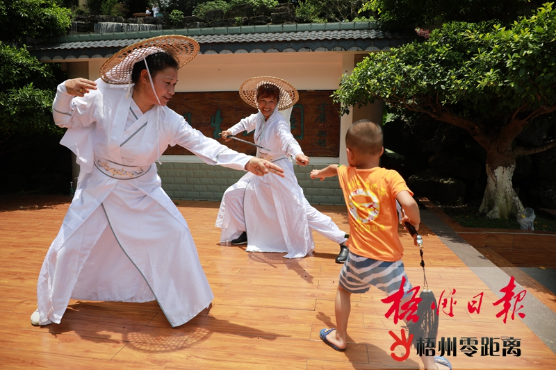 6月8日,在蒙山縣梁羽生公園,一位小朋友和武俠演員們互動。