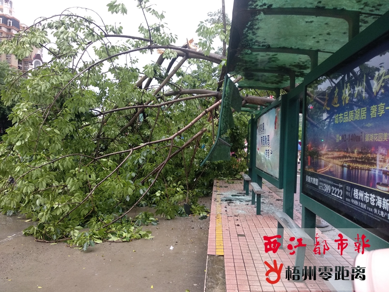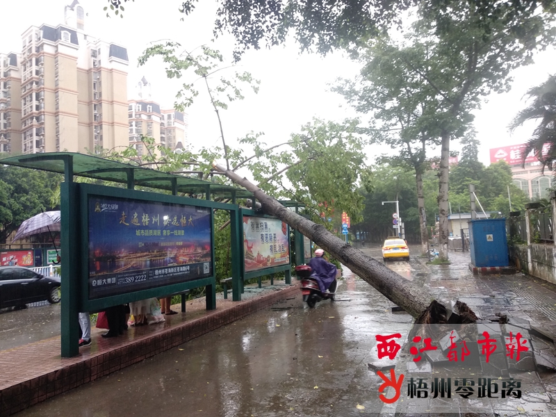 梧州零距離網-西江都市報訊 (記者 姚藍婷) 6月11日17時40分許,梧州市區天氣驟變,狂風暴雨中,紅嶺路金暉汽車客運站旁一棵高約15米的行道樹被刮倒,徑直砸向隔著一條兩輪車道的公交站臺。倒伏的行道樹不僅把公交站臺部分玻璃晴雨篷砸碎,還導致數名正在候車的市民受傷。