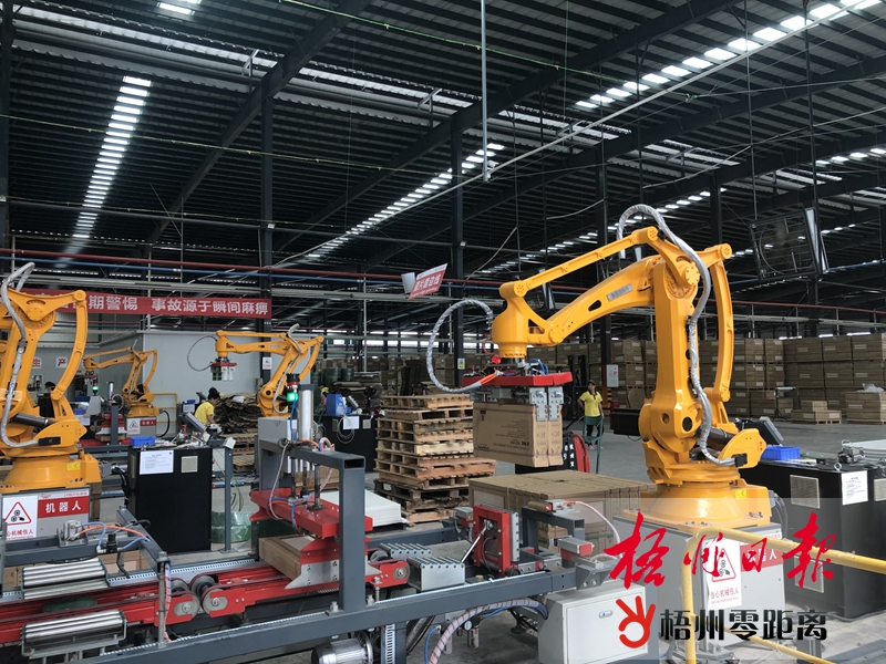 6月12日,在藤縣中和陶瓷產業園歐神諾陶瓷廣西藤縣生產基地自動化瓷片生產線上,機器人正在包裝瓷片。