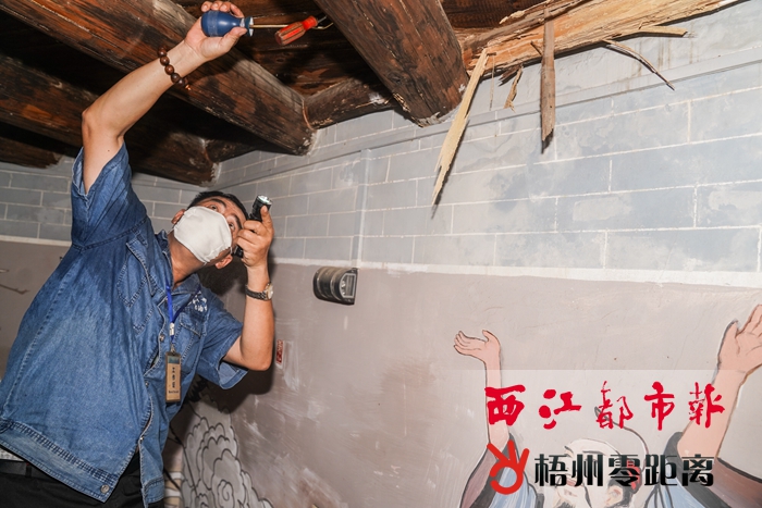 據(jù)了解,文物古建筑建造時間久遠(yuǎn),且建筑大部分采用木質(zhì)承重結(jié)構(gòu),但所有的木材幾乎沒有經(jīng)過防蟲防蛀處理,再加上古建筑周圍植被茂密、生態(tài)環(huán)境優(yōu)越,為白蟻的生存繁衍提供了良好條件。而古建筑木構(gòu)件一旦遭白蟻侵害,內(nèi)部會逐漸被蛀空,其承重力和牢固度將大大降低,甚至造成建筑物倒塌、人員傷亡等嚴(yán)重后果。 6月14日,記者跟隨梧州市白蟻防治中心的工作人員來到允升塔,在第6層,抬頭可見多根木質(zhì)橫梁表面出現(xiàn)許多彎彎曲曲、大小不一的蟻路。工作人員歐鴻新爬上梯子,用螺絲刀往一根橫梁兩端及中間敲打幾下,憑借聲音可初步判斷,橫梁已經(jīng)被白蟻蛀空。隨后,他又用螺絲刀輕輕一撬,木頭兩端部分破裂,發(fā)出清脆的響聲,并有粉狀的東西掉落。