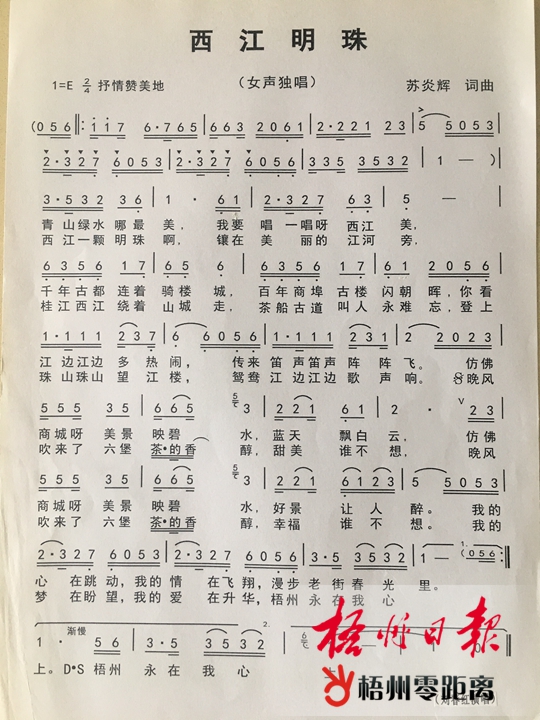 蘇炎輝把自己對(duì)梧州的情懷寄托在《西江明珠》的詞曲當(dāng)中。
