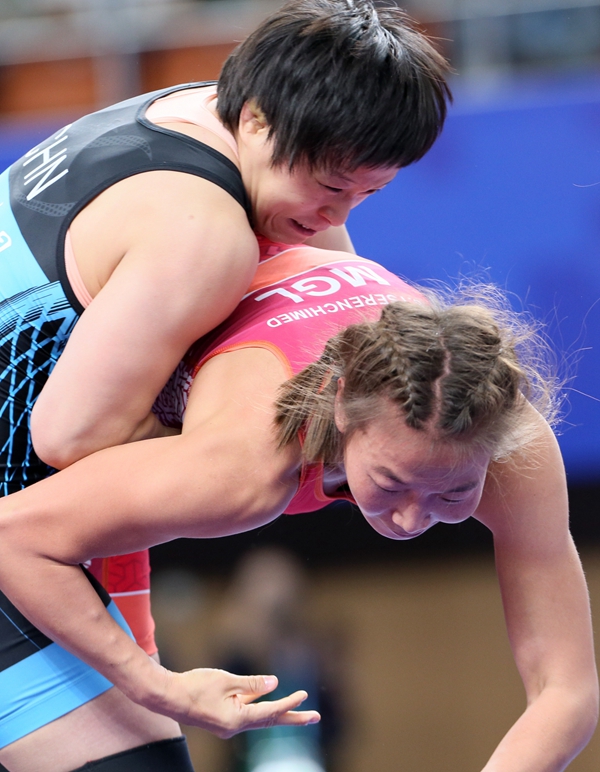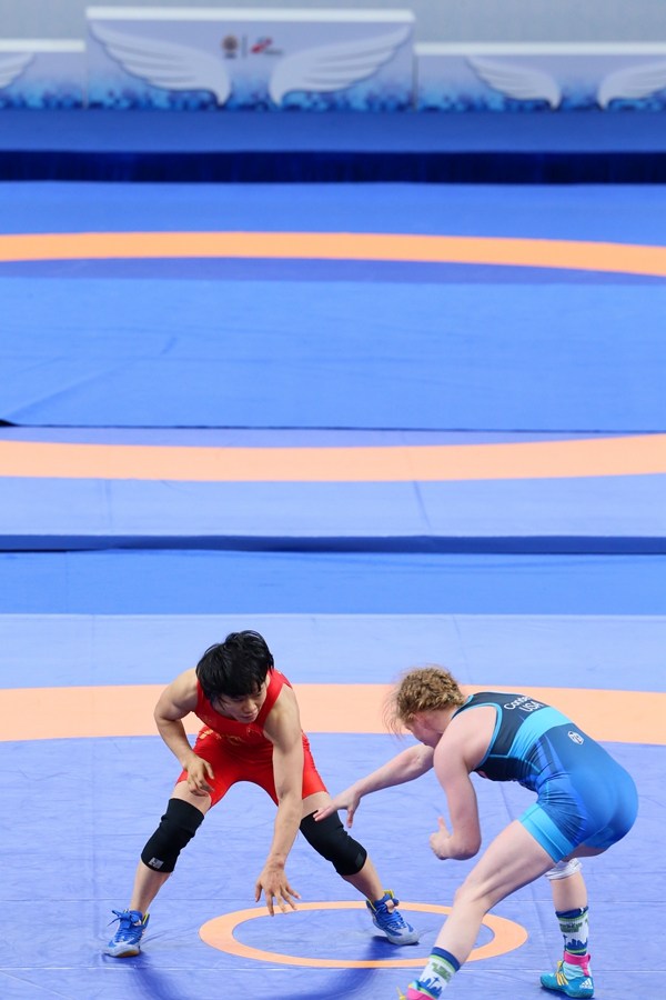 軍運(yùn)會(huì)女子自由式摔跤50公斤級決賽中,李玉燕(左)與美國選手康德對決。