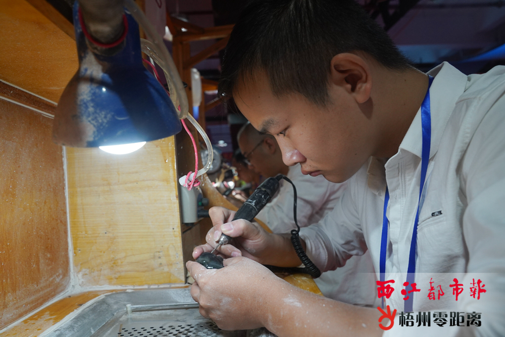 在 “西江杯”寶(玉)石作品展覽現(xiàn)場(chǎng),專家展示玉石雕刻技術(shù)。記者 楊揚(yáng) 攝 欽州參展商陸善益帶來(lái)的展銷品是南流江玉飾品及坭興陶茶壺套裝,其中一款名叫“君子杯”的茶杯,底部是一根柱子,必須將杯子放置茶托正中央才能將其放穩(wěn),設(shè)計(jì)精巧,引得一些市民愛(ài)不釋手。桂林參展商胡彥燕展出的主要是雞血玉做成的手鏈、項(xiàng)鏈等首飾。“第一次來(lái)梧州參展,想不到這里人氣這么旺。”胡彥燕對(duì)接下來(lái)幾天的展銷活動(dòng)充滿期待。