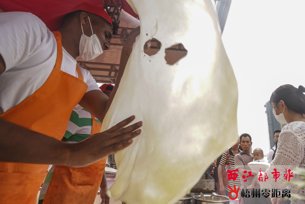 上下翻飛的印度飛餅吸引不少市民駐足觀看。 在梧州一眾美食中,豆腐花以嫩滑、香甜、清新的特點,受到廣大食客的喜愛。怡景老牌桂花糖豆腐花的攤位前聚集了大批食客,攤主蘇女士麻利地將豆腐花舀到碗里,再配上甜香的桂花糖漿,穩穩地遞給顧客。同樣,在老伯田螺的攤位上,三名工作人員忙得不可開交,她們根據食客點的菜品,忙碌地舀田螺、下河粉、淋螺汁,店鋪周邊坐滿了食客。