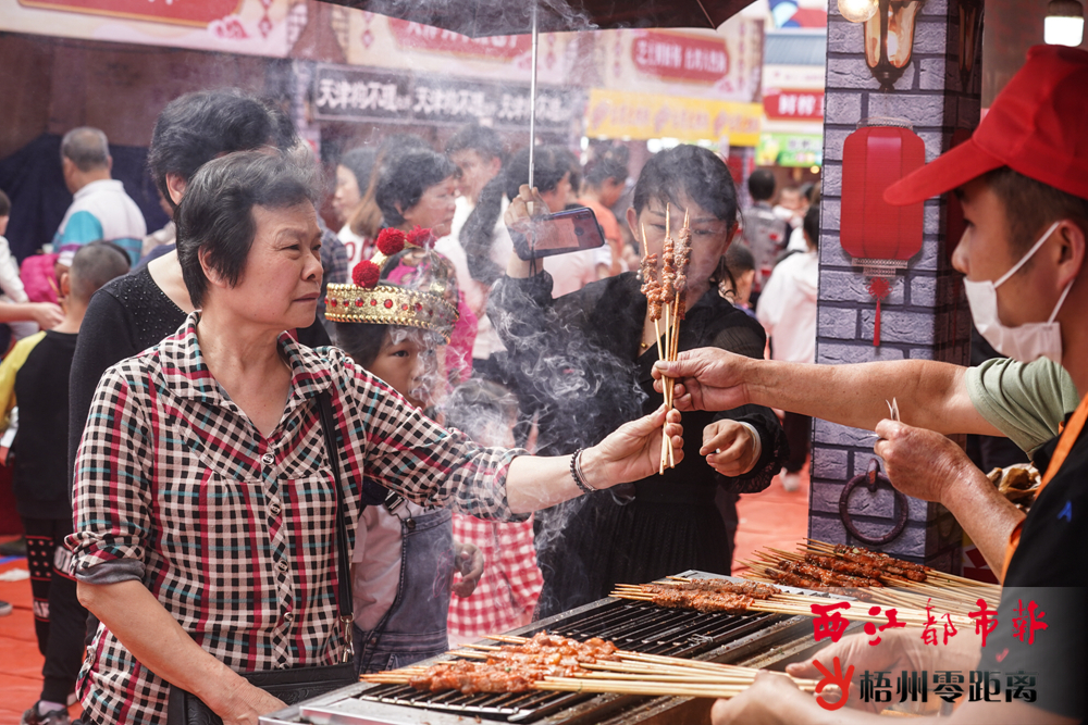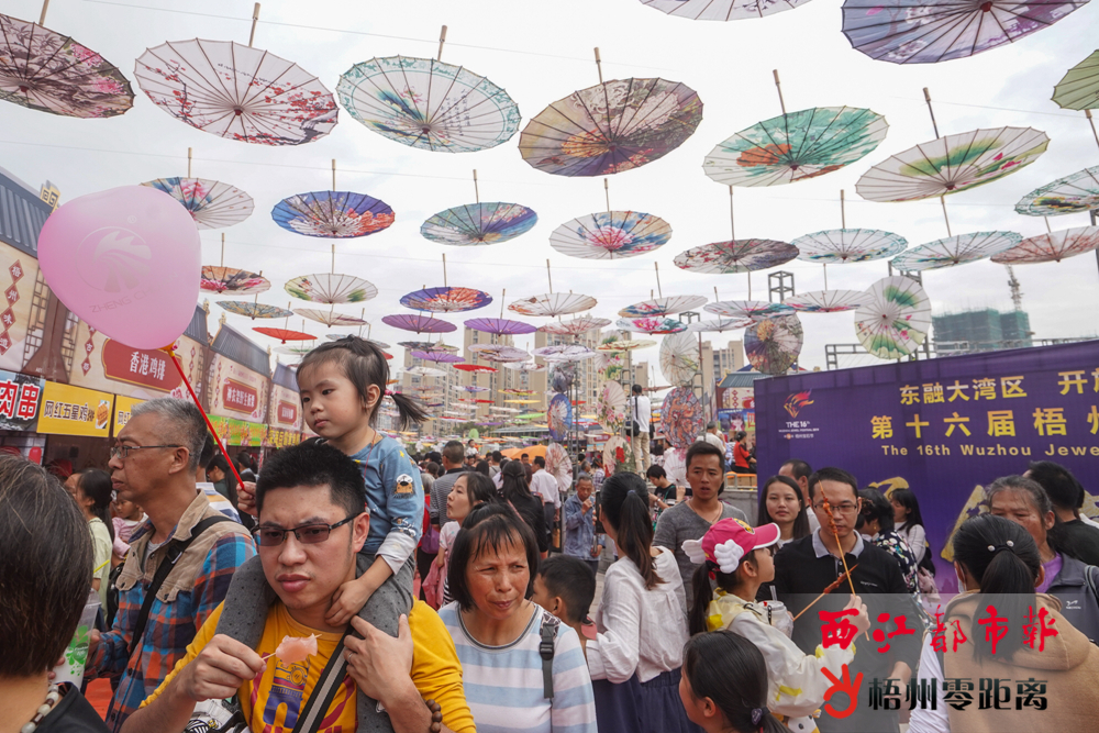 整個會場上空用油紙傘裝飾,古典而浪漫。 連片的古典紙傘遮擋著陽光、仿古設計的攤位熱鬧非凡。當天上午,不少市民一步入活動現場,就被充滿嶺南特色的會場驚艷了。而同樣令人驚艷的,還有各式各樣的美食。據了解,本屆美食嘉年華設置了上百個攤位,吸引了老伯田螺、正傳雞爪、梧州紙包雞、太平米餅、藤縣魚豆腐等本土著名美食進駐,讓廣大市民可以“一站式”盡嘗家鄉味道。此外,香港雞蛋仔、江南墨魚花、長沙香腸、臺灣香辣蟹、老北京手工糖等各地美食,也讓市民嘗盡大江南北的美味。