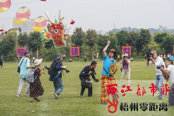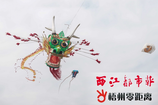 選手在比賽中奮力奔跑,使風(fēng)箏能借力飛起來。 在表演區(qū)域,龍、三葉蟲、鰩魚、錦鯉、水母等造型的大型風(fēng)箏隨風(fēng)扶搖飛上天空,點綴得藍天分外美麗。9時20分,一只懸掛著“美麗梧州我愛你”標(biāo)語的風(fēng)箏升起,讓觀眾連連叫好。表演環(huán)節(jié)最引人注目的是廣州炫風(fēng)特技風(fēng)箏隊的一只串式風(fēng)箏,它長度驚人達400米。雖然體型巨大,但風(fēng)箏師放飛技術(shù)超強,很快風(fēng)箏就在天空高高翱翔,引得在場不少小朋友興奮追逐。大家不停地用手機、相機記錄下眼前精彩的時刻。