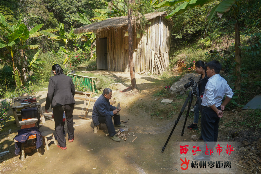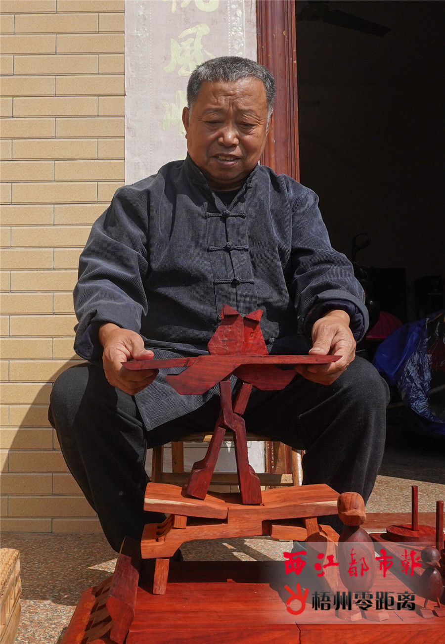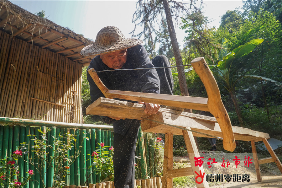 梧州零距離-西江都市報記者 蒙敏瑩 11月8日12時左右,在蒙山縣陳塘鎮幽靜山林深處,鋸木的沙沙聲與潺潺的小溪流水聲相互交融。簡陋竹茅房前,月季花、杜鵑花開得正盛,一名頭戴斗笠身著樸素唐裝老人正一腳踩在地上,一腳踩著固定木材的繩索,鋸子、鑿子、磨砂紙、斧頭在他手中交替運用,一切都得心應手。