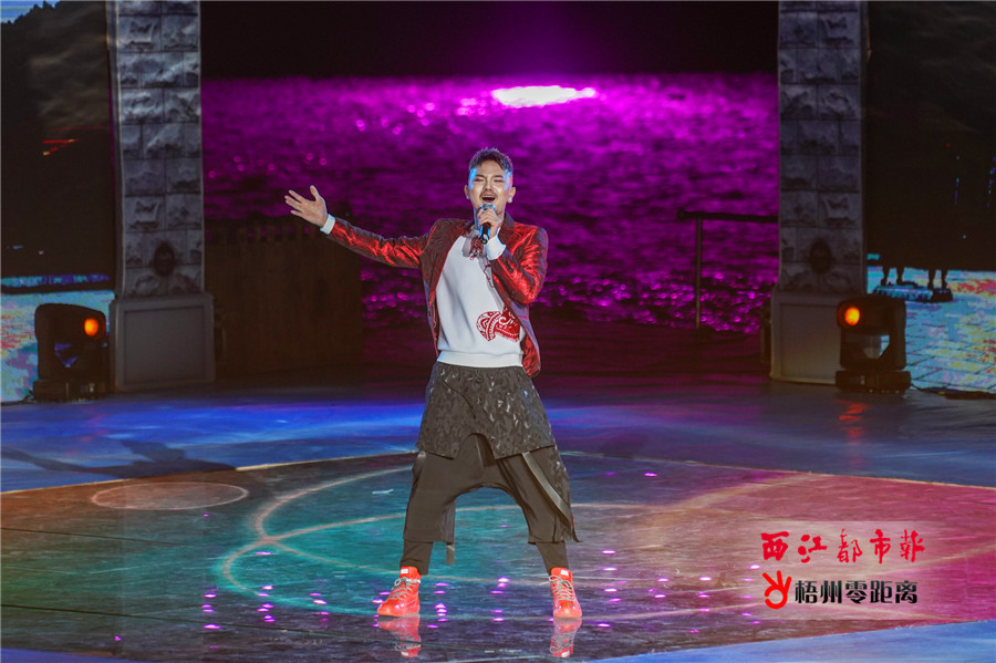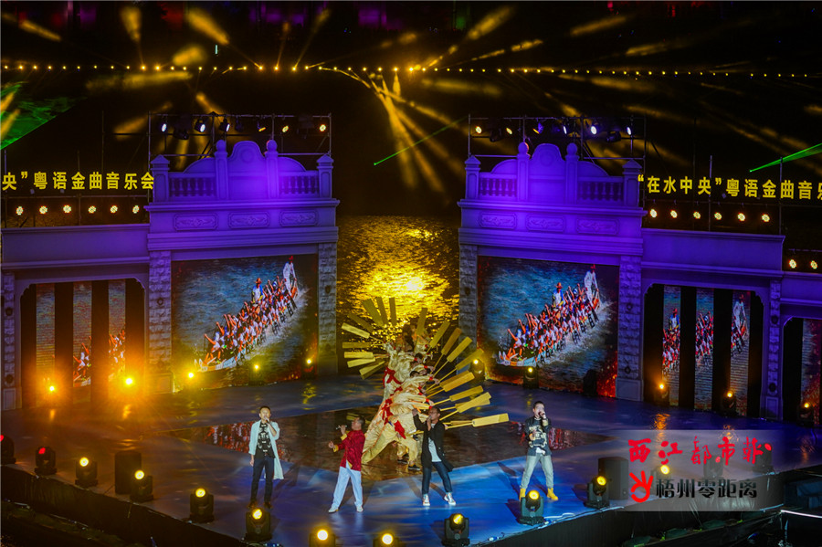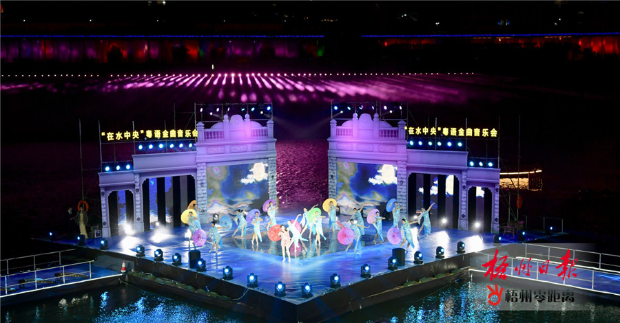 11月13日晚,演員們在江面舞臺表演粵語歌舞節目。蒙紹松 攝 水上舞臺以寶石形狀為設計元素,在“553311”市區文旅精品中的四座山環抱下,毗鄰梧州騎樓城,宛如一顆耀眼的寶石鑲嵌在江面,熠熠生輝。江水、堤岸、建筑、橋梁伴隨變幻跳躍的音樂和五光十色的燈光,共同組成一幅“鴛鴦秀水世無雙”的瑰麗畫卷。音樂會分為《鴛鴦秀水、千年古城》,《風雨騎樓、百年商埠》,《海納百川、力爭上游》三個篇章,從梧州是粵語和嶺南文化發祥地之一、騎樓城孕育了梧州百年商埠的歷史文化、新時代梧州加快“東融”開放發展等多個角度,通過一首首優美動聽的粵語金曲,仿佛讓人穿越時空,體味千年古城的秀美無雙。