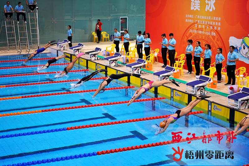 女子乙組400米雙蹼決賽中,選手們一躍而出,梧州市運動員謝盈盈在第4道出發。記者 陳凡 攝