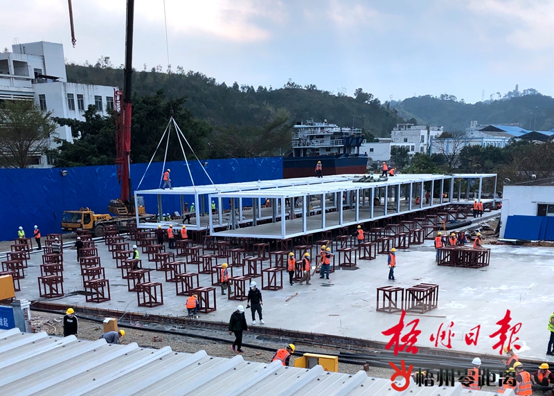 2月12日,在項目施工現場,施工人員在吊裝板房。記者 梁萍 通訊員 馮志龍 攝 ■防控新冠肺炎疫情健康知識 工作區域防護知識(一)